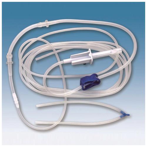 Hose set with perforator, flux control clip and integrated peristaltic pump.