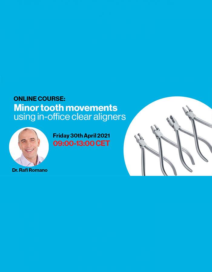 Published on March 03-03-21 Minor tooth movements using in-office clear aligners Presenter: Dr Rafi Romano Specialization: Orthodontics Location: ONLINE COURSE Course date: Friday 30th April 2021- 09:00-13:00 CET INFO AND REGISTRATION Go back to all Courses