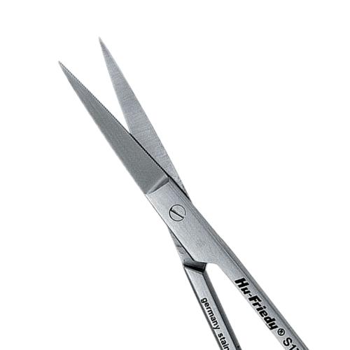 Iris Straight Super-Cut scissors with 1 serrated blade used for trimming tissue or cutting sutures. The serrated blade keeps tissue from slipping for scissors.