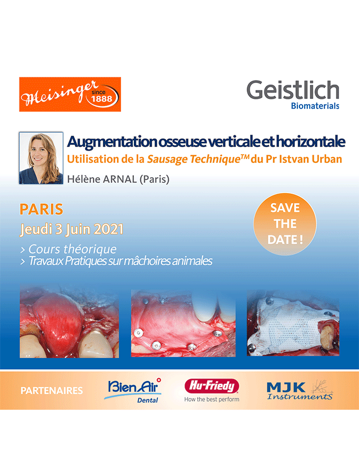 Published on janvier 01-25-21 Augmentation osseuse verticale & horizontale Conferencier: Dr Hélène ARNAL Thème: Chirurgie dentaire Lieu: Paris, France Date: Jeudi 3 Juin 2021 Brochure du cours.pdf www.geistlich.fr Retourner à tous les Cours
