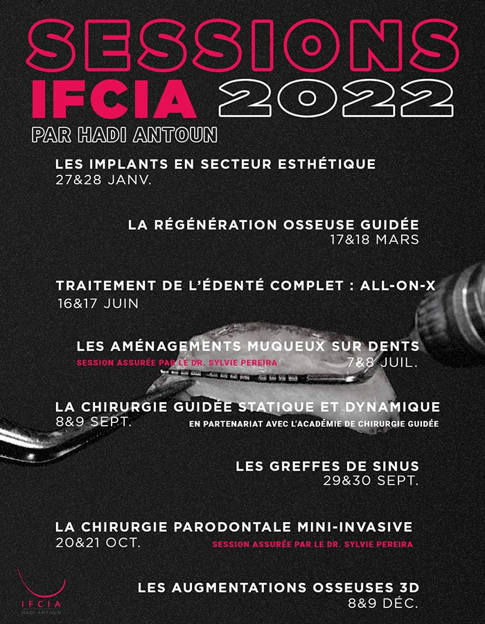 Published on février 02-14-22 SESSIONS IFCIA 2022 - Formations en implantologie Conferencier: IFCIA - HADI ANTOUN Thème: Implantologie Lieu: Paris, France Date: SESSION 2022 INFO ET INSCRIPTION Retourner à tous les Cours